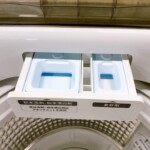 洗濯槽内も写真の通り大きな汚れやカビの付着は見られず、パルセーター周辺もきれいに保たれていました。洗剤投入口も破損や割れはなく、動作確認では給水・洗い・脱水まで問題なく作動することを確認しています。