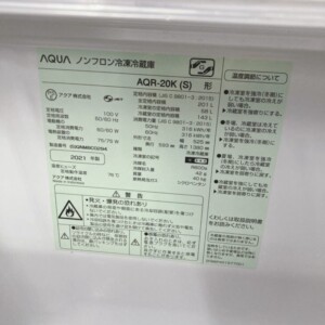 今回は港区新橋にお住まいの30代女性・会社員(単身・賃貸マンション)より、AQUA ノンフロン冷凍冷蔵庫 AQR-20K(S)(2021年製)を出張買取にてご依頼いただきました。
