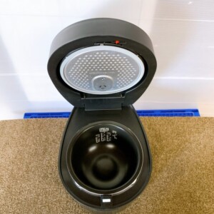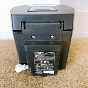 本体外装には細かな擦れキズやホコリの付着が見受けられましたが、大きな割れやへこみはありませんでした。内釜のコーティングは目立つ剥がれもなく、使用回数は比較的少なめと判断できる状態です。液晶表示も正常で、IH加熱による炊飯動作・保温機能ともに問題なく確認できました。付属品は電源コードのみで、箱や説明書は欠品している状況でした。
