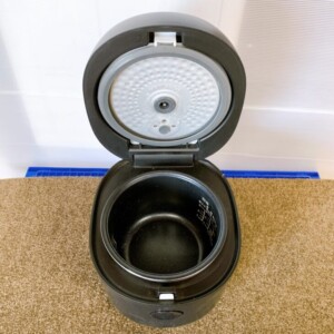本体はブラックカラーで、天面や側面に細かな擦れ傷や軽微なくすみが見受けられましたが、大きな割れやへこみはありません。内釜はコーティングの剥がれもほとんどなく、底面もきれいな状態を保っています。内ぶた部分に軽度の水滴跡はあるものの、炊飯・保温ともに動作確認済みで問題はありません。電源コードは直付けタイプで、本体のみでの査定となりました。2023年製と新しい点も確認できました。