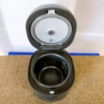 本体はブラックカラーで、天面や側面に細かな擦れ傷や軽微なくすみが見受けられましたが、大きな割れやへこみはありません。内釜はコーティングの剥がれもほとんどなく、底面もきれいな状態を保っています。内ぶた部分に軽度の水滴跡はあるものの、炊飯・保温ともに動作確認済みで問題はありません。電源コードは直付けタイプで、本体のみでの査定となりました。2023年製と新しい点も確認できました。