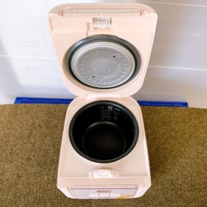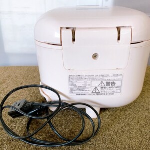 本体は淡いコーラルピンクカラーで、外観に大きな割れやへこみは見られず、比較的きれいな状態でした。フロントパネルの透明カバー部分にごく細かな擦れがあるものの目立つダメージはありません。内釜はコーティングの剥がれもなく、底面も良好なコンディションを保っています。内ぶた部分にわずかな水滴跡は確認できましたが、通電確認を行い、液晶表示・炊飯・保温機能ともに正常動作を確認済みです。電源コードも付属しております。