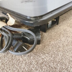 お預かりしたIH調理器は、天板中央部に吹きこぼれによる焦げ跡や白い焼き付き汚れが見受けられる状態でした。側面や操作パネル周辺にも使用に伴う細かな擦れがございます。裏面の通気口部分には若干のホコリの付着がありましたが、電源は正常に入り、加熱動作も問題なく確認できました。電源コードも付属しており、日常使用に支障のないコンディションでした。