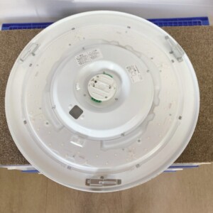 お引き取りした商品は直径のある丸型タイプのLEDシーリングライトです。カバー表面には目立つ割れや大きな傷はなく、全体的に比較的きれいな状態でした。裏面には設置時の擦れや経年による軽微な汚れが見受けられましたが、固定用スポンジやアダプター部分も破損はありません。内部のLED基板にも変色や焦げ跡は確認されず、点灯確認でも問題なく作動しました。2015年製とやや年式は経過していますが、動作良好でまだ十分に使用可能な状態です。