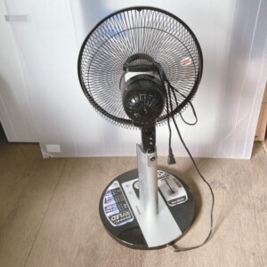 外観には使用に伴うホコリの付着や軽微な汚れが見られましたが、羽根・ガード部分に大きな破損はありませんでした。動作確認では風量調整・首振り・タイマー機能も問題なく作動し、通常使用に支障のない状態でした。