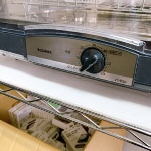 お引き取りした商品は東芝の家庭用食器乾燥器「VD-B5S」です。温風で食器を乾燥させるシンプルな構造のキッチン家電で、コンパクトながら家庭用として十分な収納容量を備えたモデルです。60分タイマー付きで、使用状況に応じて乾燥時間を設定できる仕様となっています。