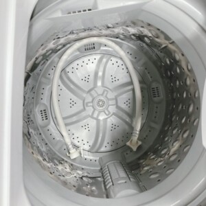 洗濯槽内部は比較的きれいな状態で、洗い・すすぎ・脱水の動作確認も問題なく作動しました。給水ホースや排水ホースなど基本的な付属品も揃っており、再販時にすぐ使用できる状態でした。