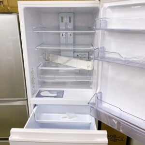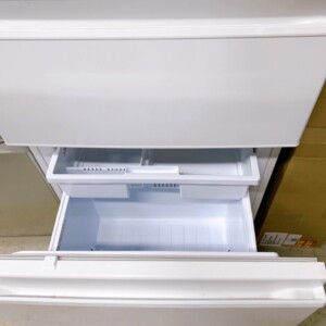 拝見した三菱電機のMR-C33K-W形は、外観に目立つ傷やへこみがなく全体的にきれいな状態でした。日常使用によるわずかな擦れはあるものの、目立つ汚れやダメージは見られません。庫内も非常に清潔に保たれており、棚板・ドアポケット・冷蔵ケース・冷凍ケースなどのパーツも破損や欠品はありませんでした。さらに庫内パーツも一式揃っている状態で、使用感も少なく中古市場でも再販しやすいコンディションでした。