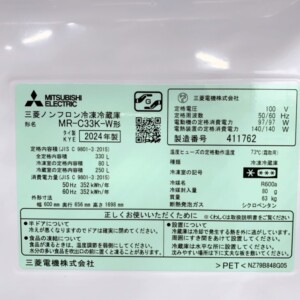神奈川県寒川町へ出張買取 三菱 ノンフロン冷凍冷蔵庫 MR-C33K-W形 2024年製 きれいな状態のため高価査定しました