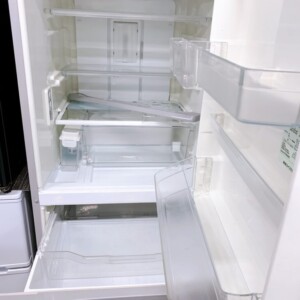 庫内の棚板やケースなどの主要パーツは揃っており、冷却動作や庫内灯などの基本機能も問題なく確認できました。庫内は軽い使用感があるものの、大きな汚れや破損はなく中古家電としては標準的なコンディションでした。
