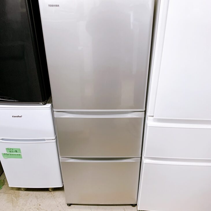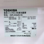 拝見した商品はTOSHIBA製の3ドア冷凍冷蔵庫 GR-H34S(S)で、容量340Lのファミリー向けモデルです。冷蔵室・野菜室・冷凍室が分かれた構造で、日常の食品保存に使いやすい設計となっています。