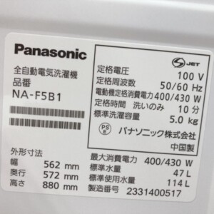 お預かりしたのは、パナソニックの全自動洗濯機 NA-F5B1です。洗濯容量は5.0kgで、一人暮らしや寮生活にちょうど良いサイズ感のモデルとなっています。操作パネルもシンプルで、普段使いしやすい点が特徴です。