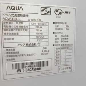 今回は埼玉県南埼玉郡宮代町にお住まいの30代女性(会社員・単身世帯/賃貸マンション)より、AQUA ドラム式洗濯乾燥機 AQW-D8R-L(2024年製)を出張買取にてご依頼いただきました。