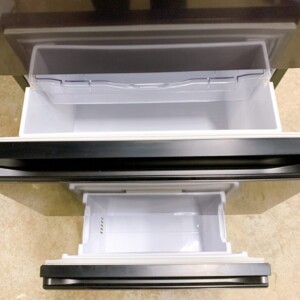 お預かりしたR-V32RV(K)は、外装のブラックカラー部分に大きなキズやへこみは見られず、全体的に良好なコンディションでした。冷蔵室内の棚板やケースも欠品がなく、透明ケースやガラス棚の状態もきれいで、使用感は比較的少ない印象でした。