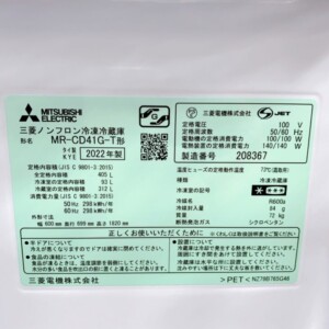 今回査定した三菱 MR-CD41G-Tは2022年製で比較的新しいモデルであり、405Lクラスの容量はファミリー向けとして中古市場でも需要が高いサイズです。さらに今回の個体は外装の状態が良好で、庫内も非常に清潔、付属品もすべて揃っているという点が大きな評価ポイントとなりました。