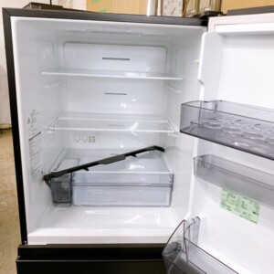 庫内を確認したところ、棚板・ドアポケット・野菜ケースなどのパーツも揃っており、内部も清潔で汚れやにおい残りも少ない状態でした。冷却動作も問題なく、冷蔵室・冷凍室ともに正常に機能していることを確認できました。全体的に丁寧に使われていた印象の良いコンディションでした。