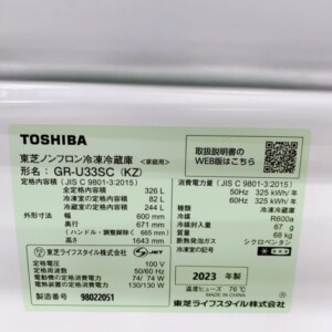 今回査定した東芝 GR-U33SC(KZ)は2023年製と年式が新しく、326Lクラスの容量は中古市場でも需要の高いサイズです。また外装の状態が良好で、庫内も清潔かつ付属パーツがすべて揃っている点が査定評価につながりました。