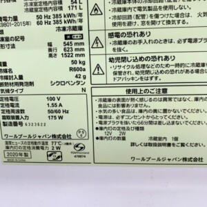 査定した冷蔵庫は2020年製で、外装はホワイトカラーのシンプルなデザインです。外観には使用に伴う軽微な擦れは見られましたが、目立つ大きな傷やへこみは確認されませんでした。