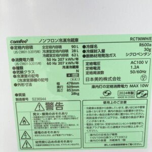 今回は神奈川県三浦郡葉山町にお住まいの20代男性・会社員(単身/賃貸アパート)のお客様より、comfee(コンフィー)ノンフロン冷凍冷蔵庫 RCT90WH/E(2024年製)を出張買取にてご依頼いただきました。