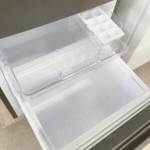 お預かりしたSJ-D15K-Hは、庫内の棚板やケースがすべて揃っており、内部も清潔感のある状態でした。冷蔵室のガラス棚や野菜ケースにも大きな傷や割れは見られず、日常使用による軽い擦れ程度で全体として良好なコンディションです。外装についても目立つへこみや大きなダメージは確認されず、比較的新しい2024年製という点もあり中古市場でも再販しやすい状態でした。