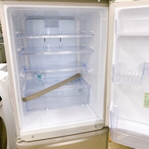 庫内の棚板やドアポケット、野菜ケース、冷凍引き出しなどの付属パーツも揃っており、庫内は清掃された状態で清潔感がありました。冷却動作も正常で、家庭用冷蔵庫として問題なく使用できる状態でした。