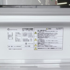 今回は埼玉県毛呂山町にお住まいの20代男性(学生・単身・賃貸アパート)のお客様より、TOHOTAIYO 2ドア冷凍冷蔵庫 TH-138L2-BK(2019年製)の出張査定をご依頼いただきました。
