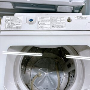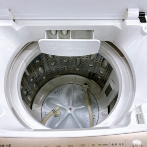 洗濯槽内部も比較的清潔な状態で、強い汚れやサビの付着は確認されませんでした。給水ホースや排水ホースなども確認でき、通常使用に必要な基本的なパーツが揃っている状態でした。中古家電としては再販しやすいコンディションであり、査定においても評価しやすい状態でした。