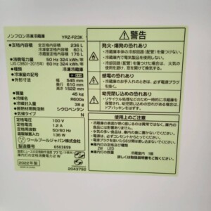 今回ご依頼いただいたヤマダセレクト ノンフロン冷凍冷蔵庫 YRZ-F23Kは、236Lクラスの2ドア冷蔵庫で単身世帯や少人数世帯に需要があるモデルです。さらに2022年製と比較的新しい年式であり、外観・庫内ともに状態が良好だった点を評価しました。