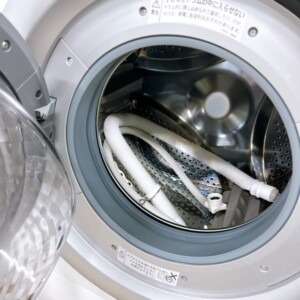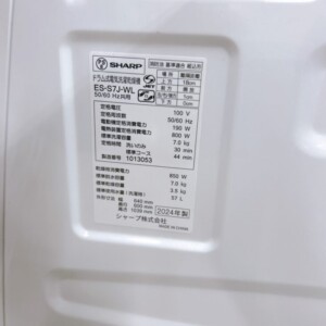 拝見したES-S7J-WLは2024年製の比較的新しいドラム式洗濯乾燥機で、外観は全体的にきれいな状態でした。天板や操作パネル部分に目立つ傷やへこみは見られず、洗剤投入口や操作ボタン周辺にも強い汚れは確認されませんでした。ドラム内部もステンレス槽が非常にきれいで、カビや汚れの付着はほとんど見受けられません。付属していた給排水ホースも確認でき、洗い・すすぎ・脱水・乾燥の各機能も正常に動作していました。中古市場で再販するうえでも十分に価値のあるコンディションでした。