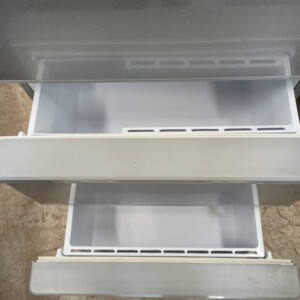 庫内を確認すると、ガラス棚やドアポケット、野菜ケース、冷凍室の引き出しなどの付属パーツはすべて揃っており、破損も見られません。内部は清掃されており、目立つ汚れや臭いもなく、非常にきれいな状態でした。冷却動作も問題なく、冷蔵・冷凍ともにしっかりと冷えることを確認しています。