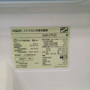 今回は東京都小平市にお住まいの30代女性(会社員・単身・賃貸(マンション))より、AQUA ノンフロン冷凍冷蔵庫 AQR-27K(S)(2021年製)を出張買取にてご依頼いただきました。272Lの容量を備えた3ドアタイプの冷蔵庫で、冷蔵室・冷凍室・野菜室が独立している使い勝手の良いモデルです。幅約600mmのスリム設計でありながら収納力があり、単身世帯から二人暮らしまで幅広く使われている人気シリーズの冷蔵庫です。