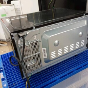 庫内も比較的きれいで、付属の角皿(オーブントレイ)も揃っており、油汚れや焦げ付きなどの強い使用跡は見られませんでした。通電確認を行い、レンジ加熱・操作パネルの動作など基本的な機能が問題なく作動することを確認しました。