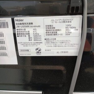 今回は東京都港区新橋にお住まいの30代男性(会社員・単身・賃貸(マンション))より、Haier 全自動洗濯機 JW-U55MK(2025年製)を出張買取にてご依頼いただきました。5.5kg容量の全自動洗濯機で、単身世帯や少人数家庭向けのモデルとして人気のあるサイズです。Haierの生活家電はシンプルな操作性とコストパフォーマンスの高さから、中古市場でも一定の需要があり、年式が新しい個体は特に評価しやすい傾向があります。