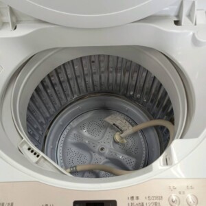 一方で洗濯槽内部は比較的きれいで、強い汚れやカビの付着は確認されませんでした。写真でも確認できる通り槽内の状態は良好で、再販時にも評価しやすい内容です。また、給水ホースも付属しており、設置後すぐに使用できる基本的な付属品が揃っている点も査定ではプラス材料となりました。