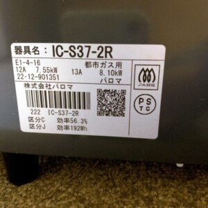 お引き取りした商品はパロマ製のガステーブル「IC-S37-2R」で、2022年製の都市ガス対応モデルです。2口コンロに魚焼きグリルが付いた家庭用のスタンダードタイプで、一人暮らしやファミリー世帯まで幅広く使用されている機種です。