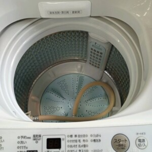 洗濯槽の内部を確認したところ、槽内は比較的きれいな状態で、カビや強い汚れの付着は見られませんでした。中古家電として再販する際には内部状態が重要なポイントになりますが、今回の個体は清潔感のある状態でした。また給水ホースも付属しており、基本的な付属品が揃っている状態でした。