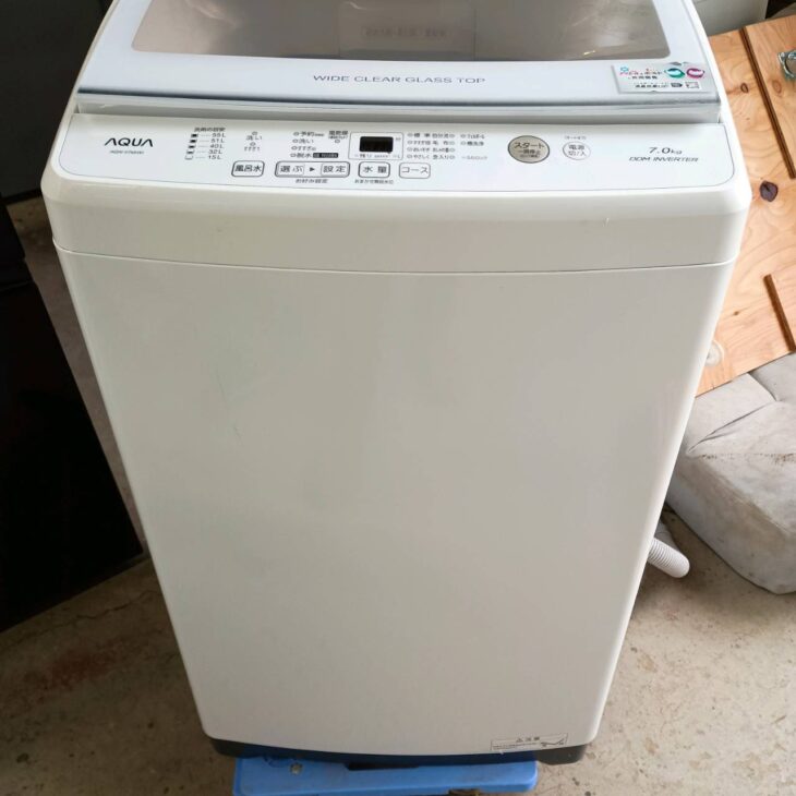 今回は東京都国立市にお住まいの30代男性・会社員・単身世帯・賃貸(マンション)より、AQUA 全自動電気洗濯機 AQW-V7M(7kg)を出張買取にてご依頼いただきました。AQW-VシリーズはAQUAの縦型洗濯機の中でも家庭用として広く普及しているモデルで、7kg容量は単身世帯から二人暮らしまで幅広く使用されているサイズです。中古市場でも比較的流通が多いカテゴリーの洗濯機であるため、状態を確認したうえで査定を行いました。