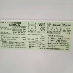 今回は東京都福生市にお住まいの20代女性・会社員・単身世帯・賃貸(アパート)より、シャープ ノンフロン冷凍冷蔵庫 SJ-D15J-W(2023年製)152Lを出張買取にてご依頼いただきました。152Lクラスの冷蔵庫は一人暮らし向けとして人気が高く、コンパクトながら収納力があるため中古市場でも流通の多いサイズです。今回のお品物も2023年製と比較的新しい年式であったため、状態を確認したうえで査定を行いました。