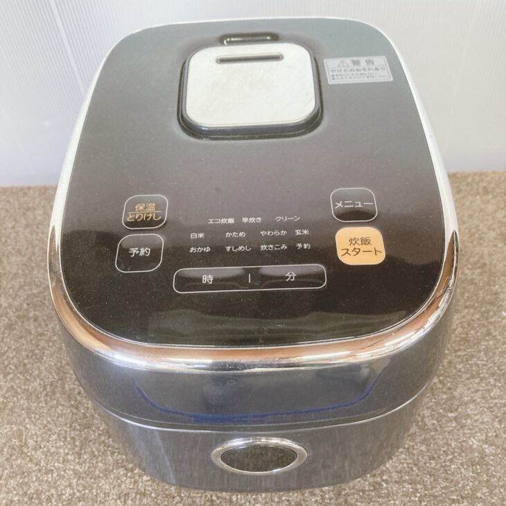 ご依頼いただいたお品物は、Amazon Basicsの3合炊きIH炊飯器 MB-HS2015-Bです。外観には日常使用による細かな擦れや薄い小傷、表面のくすみが見受けられましたが、大きな割れや目立つ破損はありませんでした。内ぶたまわりには使用に伴う細かな汚れの付着が見られ、内釜にも軽い使用感はありましたが、コーティングの大きな剥がれまでは確認されていません。電源コードも揃っており、3合炊きの単身向け炊飯器としては再利用しやすい状態でした。