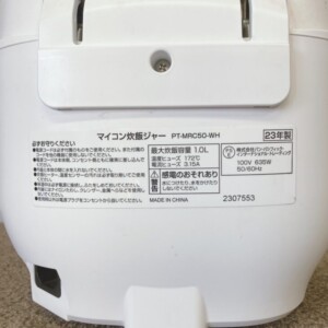 今回のPT-MRC50-WHは2023年製と比較的新しいモデルである点が評価ポイントでした。一方で、一般的なマイコン炊飯器は中古市場での販売価格が高額になりにくいため、市場流通価格や需要を考慮して査定を行いました。内釜の状態や動作が良好で再販可能と判断できたこと、当社では中古家電の販売ルートを複数確保していることから、1,500円での買取価格をご提示しました。一般的なリサイクルショップでは処分扱いになることもありますが、当社では海外需要や再販売ルートを活かし価格をつけることが可能です。