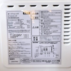 ターンテーブルや庫内トレーなどの付属パーツも揃っており、ボタン操作・加熱動作ともに問題なく確認できました。2025年製と比較的新しいモデルである点も評価につながり、家庭用オーブンレンジとして中古市場でも需要が見込める状態でした。
