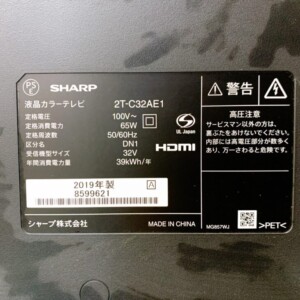 お引き取りした商品はSHARPの液晶テレビ「2T-C32AE1」です。2019年製の32V型モデルで、地上デジタル・BS・CS放送に対応した家庭用テレビとなります。