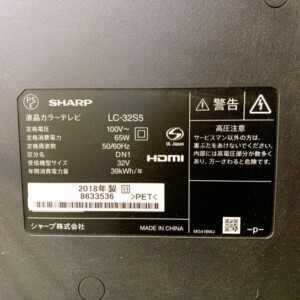 拝見した商品はSHARPの液晶カラーテレビ「LC-32S5」で、2018年製の32V型モデルです。シンプルなデザインで設置しやすく、地上デジタル・BS・CSチューナーを内蔵した使い勝手の良いテレビとして現在でも需要のあるモデルです。