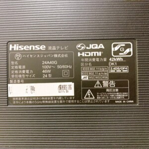 拝見した商品はHisense製 液晶テレビ「24A40G」で、2021年製の24型テレビです。地上デジタル・BS・CSチューナーを搭載したコンパクトテレビで、HDMI入力やUSB端子なども備えており、外付け機器との接続もしやすいモデルです。