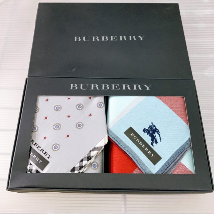 拝見した商品はBURBERRYのハンカチ2枚セットで、ブランドロゴが入った専用ボックスに収納されたギフト仕様の商品でした。1枚はバーバリーらしいクラシックな柄をベースにしたデザイン、もう1枚はブランドロゴ刺繍が入ったカラー切り替えデザインで、どちらも上品な印象のあるアイテムです。