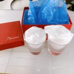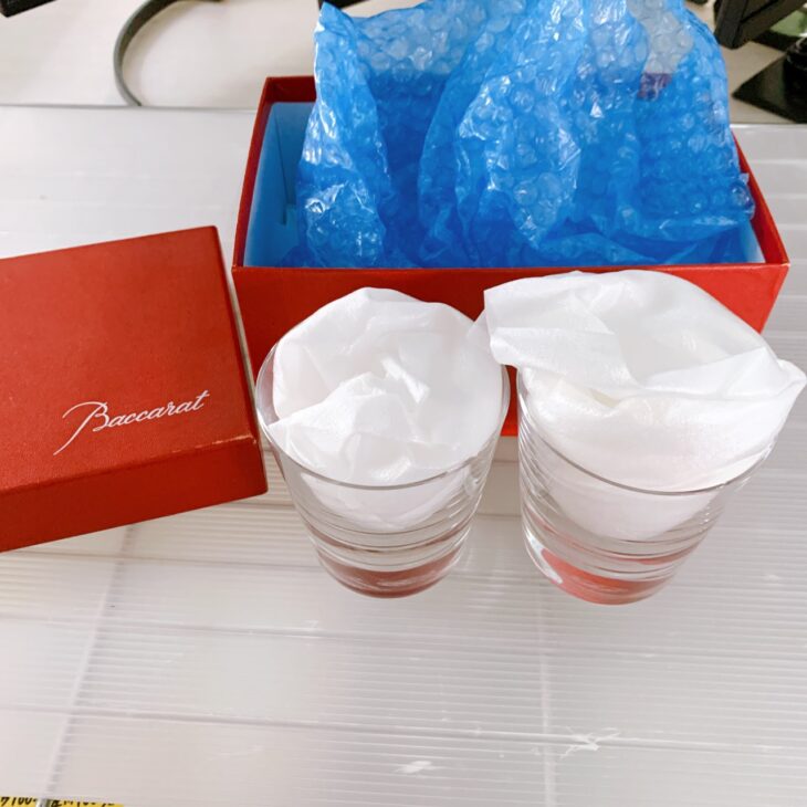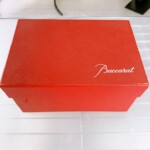また、今回のお品物にはバカラの赤い化粧箱が付属しており、保管状態も良好でした。外箱には保管時にできた軽微な擦れが見受けられましたが、グラス自体のコンディションには大きな問題はありません。ブランド食器の場合、箱の有無やペアセットで揃っているかどうかも査定時の重要なポイントとなります。
