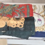 状態としては大きな破れや強い汚れは見られないものの、保管によるシワや軽微な使用感が見受けられる状態でした。ブランドタグのあるCHANELのスカーフも含まれており、素材はシルク系の生地で光沢感も残っていました。
