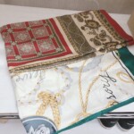 今回お預かりしたのはCHANEL PARISのシルクスカーフを含む複数のファッションスカーフでした。写真の通り、華やかな柄のデザインが特徴で、チェーン柄や花柄などクラシックなモチーフのアイテムが揃っていました。