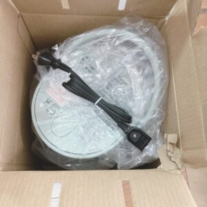 お品物を確認したところ、外箱が残っており、本体はビニール袋に入った状態で保管されていました。電源コードなどの付属品も揃っており、使用された形跡はほとんど見られません。箱の外装には保管時にできた軽い折れや角の潰れが確認できましたが、本体自体には目立つ傷や汚れはなく、全体的にきれいな状態でした。