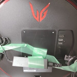お預かりしたお品は、LGの31.5インチゲーミングモニター UltraGear 32GN600-Bです。写真では前面液晶に大きな割れや目立つ傷は見受けられず、外観全体も比較的整った印象でした。背面には緑色のテープでケーブルや付属アダプター周辺が固定されており、保管時または使用時の仮留めと思われる状態が見受けられました。液晶面に目立つ割れは確認できないものの、背面まわりは通常使用品より使用感が強く、外観状態を踏まえて査定しました。2022年製の表記も確認でき、年式としても極端に古いモデルではない点が評価しやすい状態でした。元箱の有無は確認できませんでしたが、モニター本体と電源関係が揃っていたため、再販時の案内がしやすいお品として拝見しました。